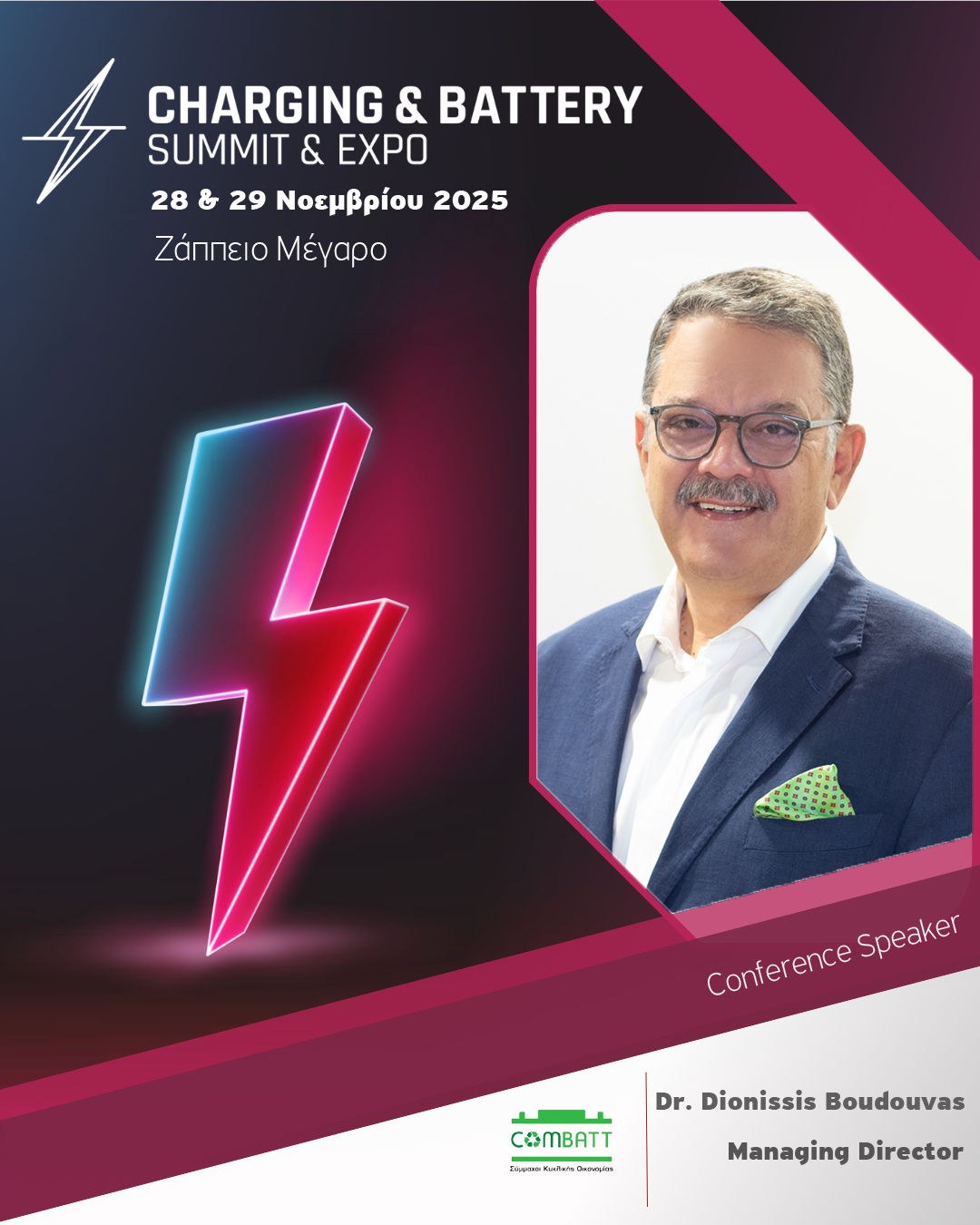 Στο πλαίσιο αυτό, ο Δρ. Διονύσης Μπουντούβας, Διευθύνων Σύμβουλος της COMBATT, θα είναι ομιλητής στο 7ο Renewable & Storage Forum, την Πέμπτη 23 Οκτωβρίου 2025, παρουσιάζοντας το θέμα: